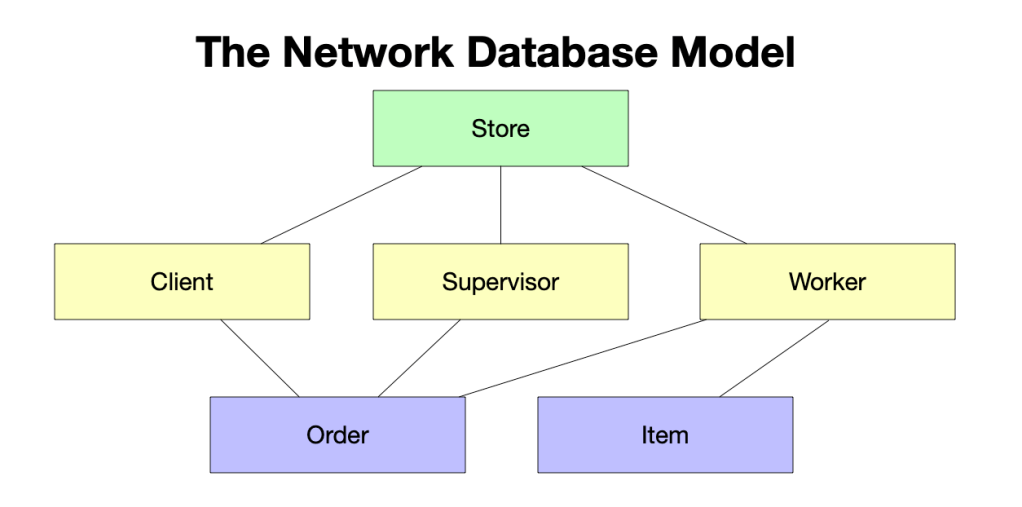The main difference between the hierarchical model and the network model is that the network model allows each record to have more than one parent and child record. In fig. 2, the “Client”, “Supervisor” and other boxes represent what in database terminology are called entities. The network model allows entities to have relationships, just like in real life. In the example, an order involves a customer, supervisor and worker – as it would if a client walked into a store and bought a product.